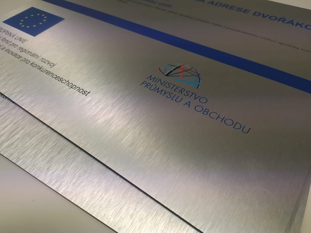 3mm deska z kartáčovaného dibondu (hliník/plast/hliník) stříbrný povrch (imitace eloxovaného hliníku), vhodná pro označení projektů Evropské Unie.